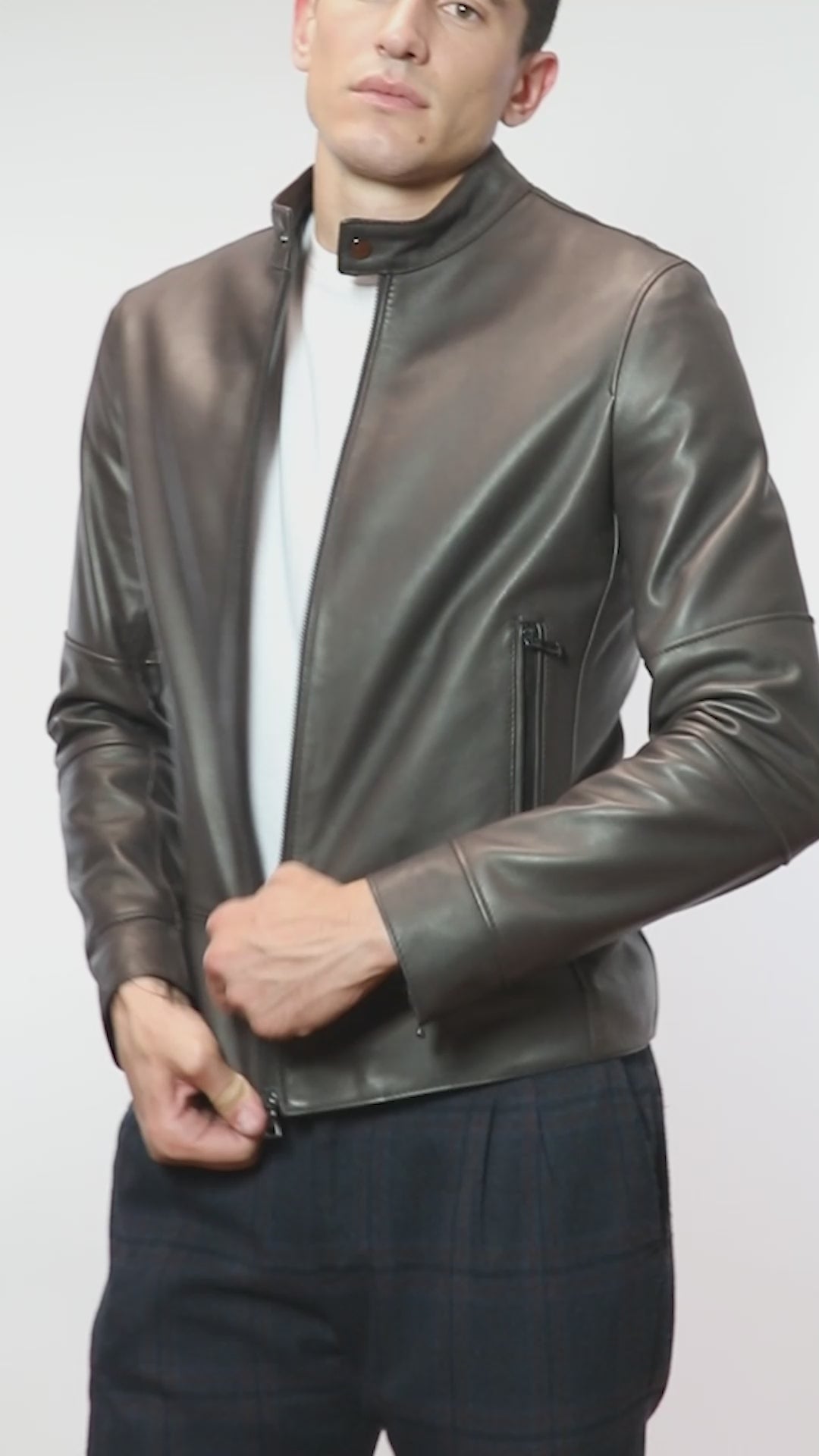 Biker Cuir Véritable AZ0076 Col tamponné. Brun
